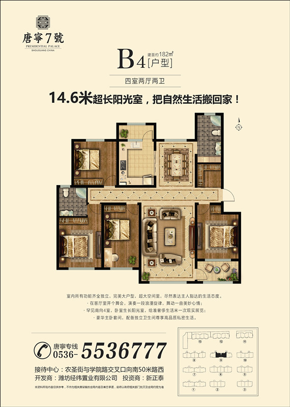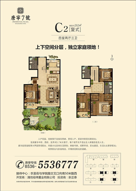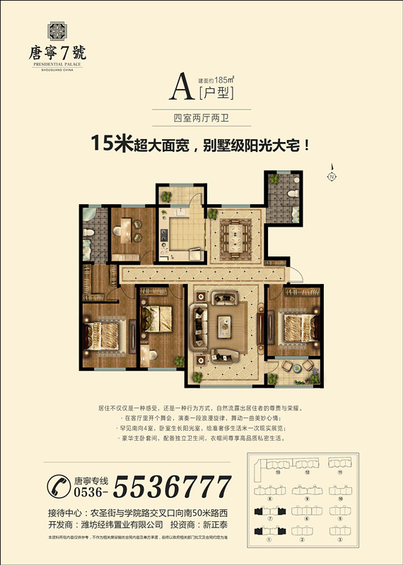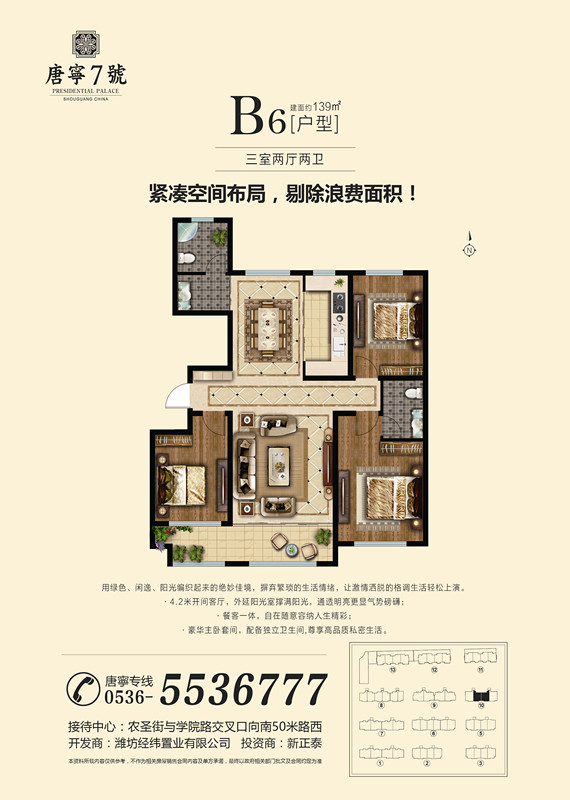 我們的戶型有105——190㎡景區(qū)洋房,210-360㎡的復(fù)式疊拼。我們項目以“ 健康、環(huán)保、人文居住 ”為主題,項目無論是產(chǎn)品定位,還是在規(guī)劃設(shè)計方面,都將打造成**的居住環(huán)境,產(chǎn)品采用通風(fēng)采光效果較好的板式建筑,每一個戶型都是采取設(shè)計師的精雕細(xì)琢。所有產(chǎn)品均是在采取客戶的建議和意見開發(fā)基礎(chǔ)上,結(jié)合壽光本地居住習(xí)慣設(shè)計而成,所有房源均南北通透,方正實用,保證居住舒適性。