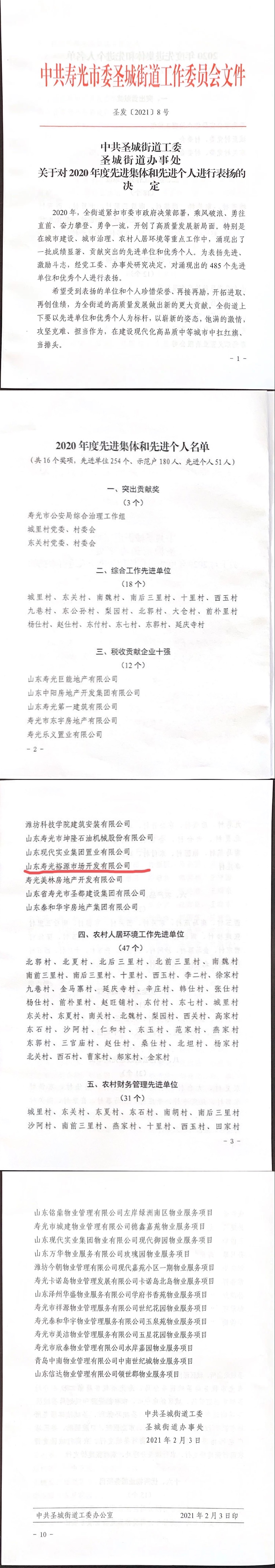 2021年3月,新正泰控股公司山東壽光裕源市場開發(fā)有限公司被中共壽光市圣城街道工作委員會授予“稅收貢獻(xiàn)企業(yè)十強(qiáng)”榮譽(yù)稱號。