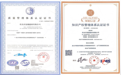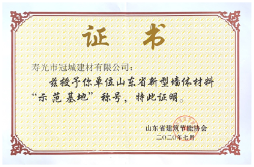 公司曾榮獲濰坊市守合同重信用企業、新型城鎮化建設**單位、壽光市依法行政監督**單位等榮譽,先后通過了質量管理體系認證、知識產權管理體系認證。山東省新型墻體材料示范基地、山東省建筑節能協會常務理事、山東省建筑節能協會新型墻體材料分會副會長單位。
